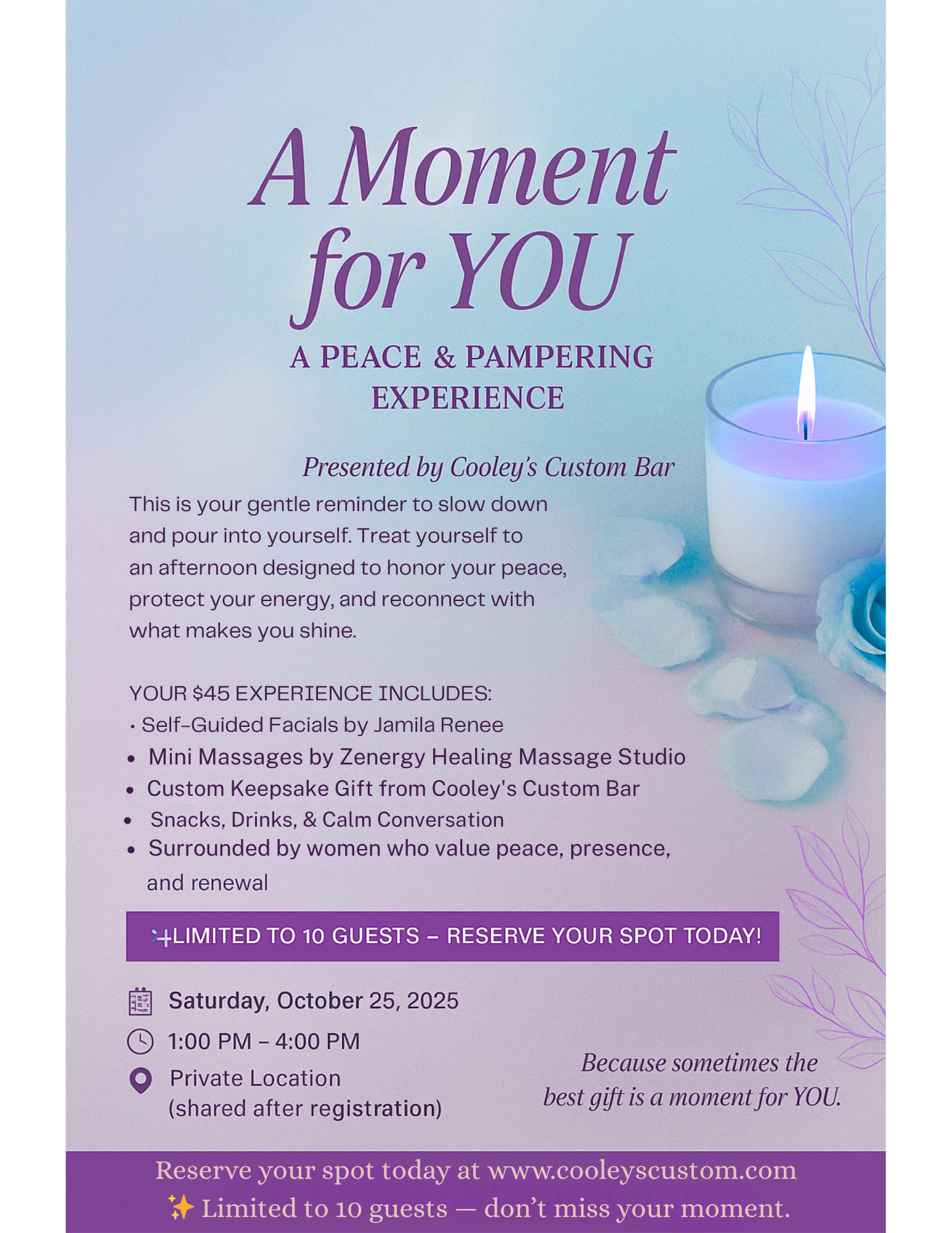 A Moment for You is more than an afternoon — it's a promise to honor your peace, protect your energy, and reconnect with what makes you shine.